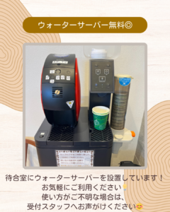 当院では待合室にウォーターサーバーを設置していますので、お気軽にお使いいただけたらと思います💡